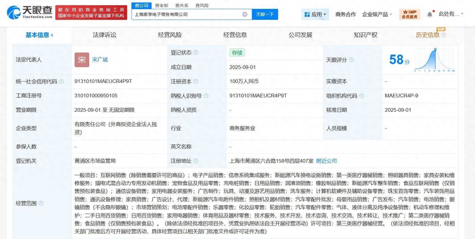 天眼查工商信息显示,近日,上海家享电子商务有限公司成立,法定代表人为宋广斌,注册资本100万人民币,经营范围含互联网销售、信息系统集成服务、新能源汽车换电设施销售、充电桩销售、新能源汽车整车销售、食品互联网销售、通信设备销售、汽车零配件批发、市场营销策划等。股东信息显示,该公司由浙江天猫技术有限公司全资持股。