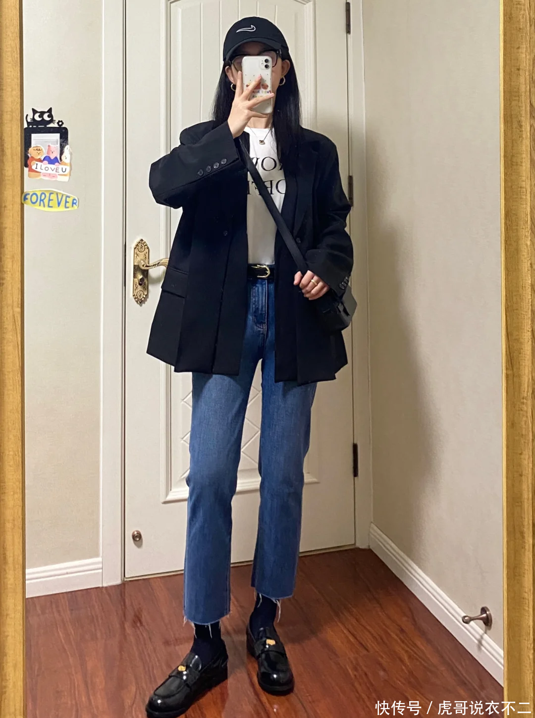 西装总被贴上"严肃"标签?那是你没试过乐福鞋的魔法。选择带有垫肩的黑色西装,内搭简约的白色T恤,将袖口随意卷起露出手腕,知性中透出松弛感。九分微喇牛仔裤恰好露出脚踝,搭配金属马衔扣乐福鞋,瞬间打破职场的沉闷结界。