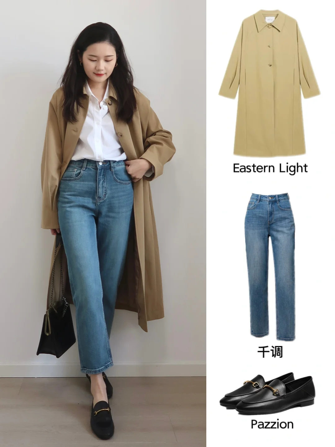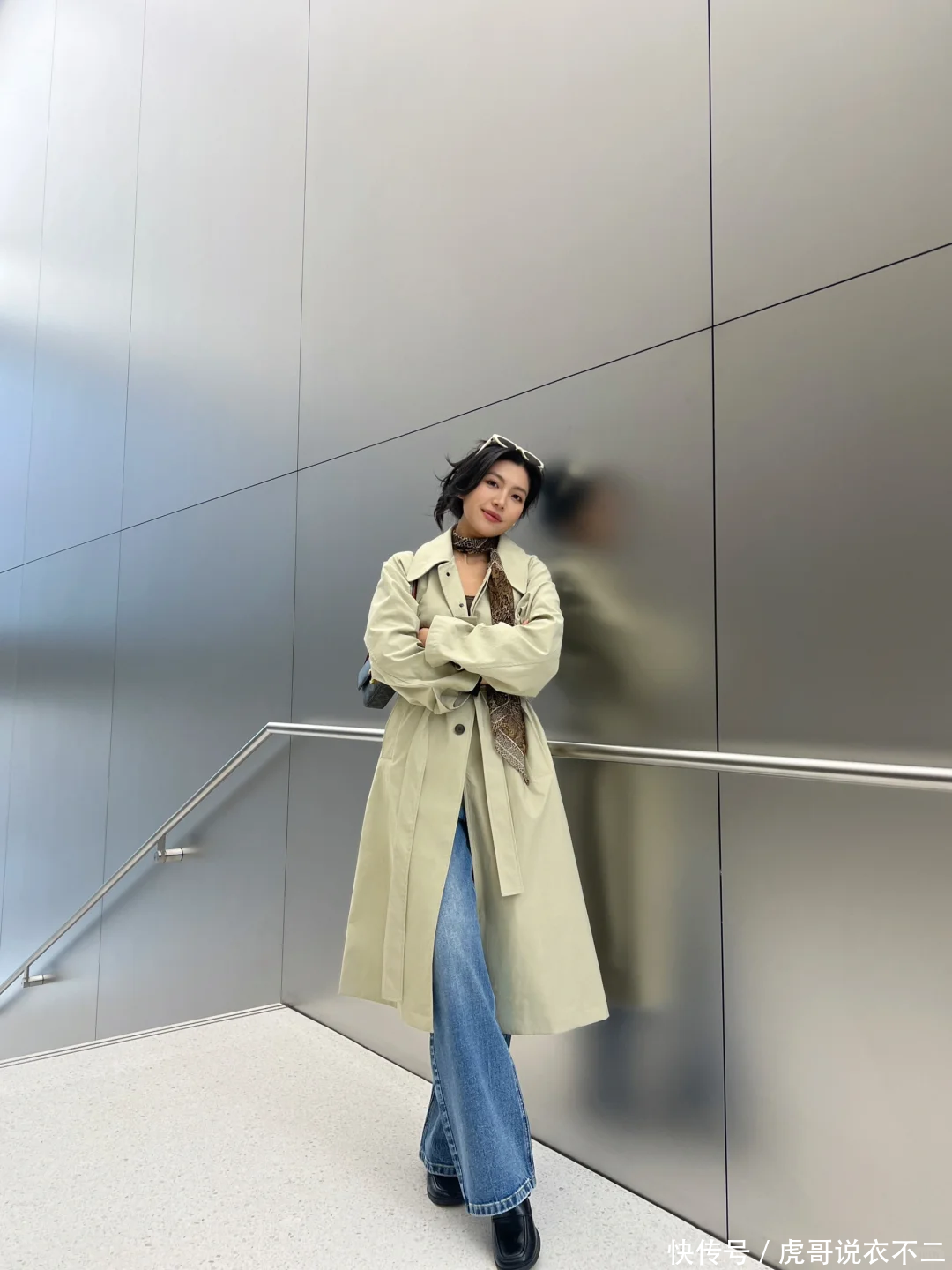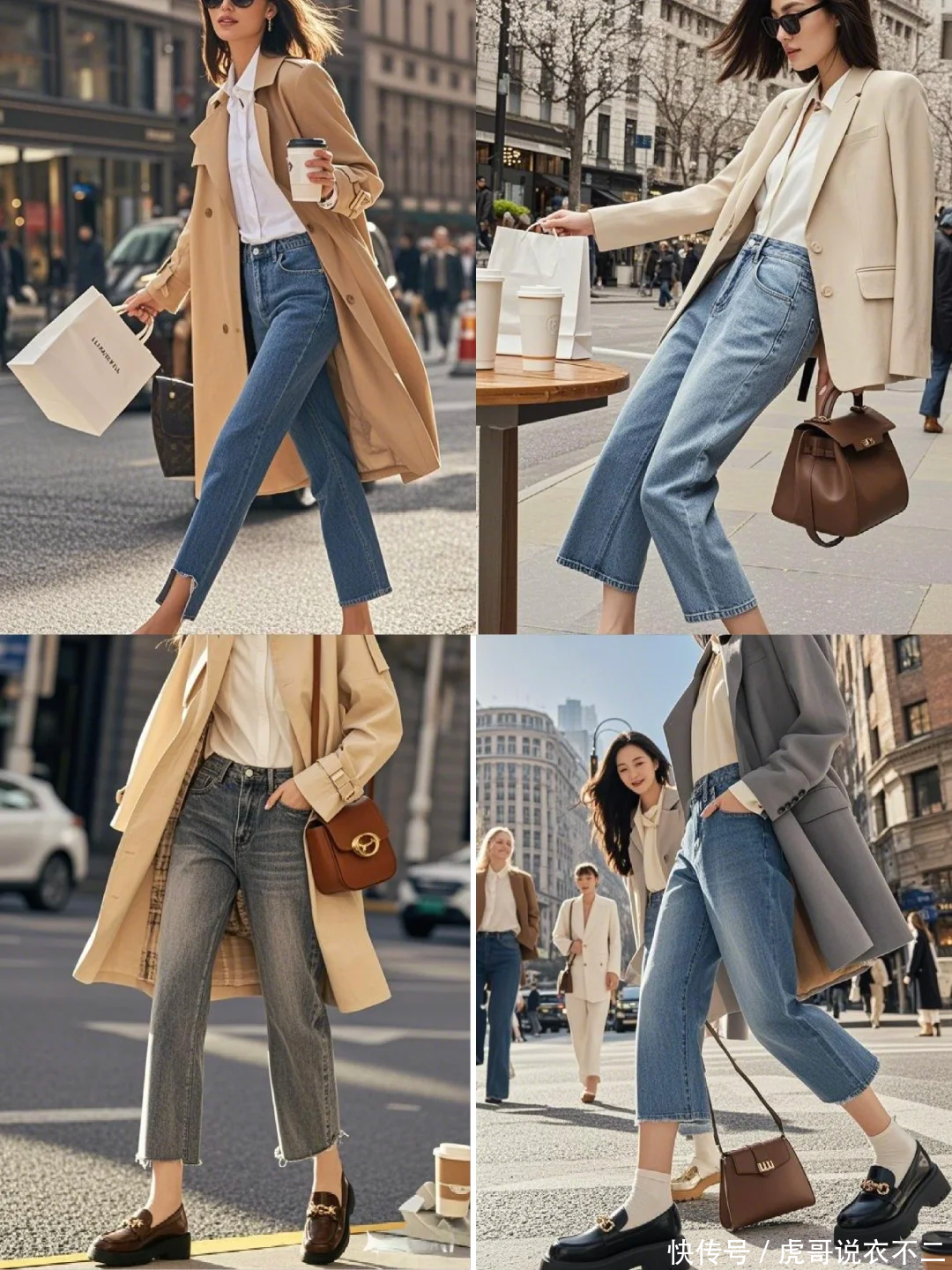 二、乐福鞋+牛仔裤+风衣:法式街头的浪漫叙事卡其色风衣是春日永恒的诗篇,但穿出新意需要巧思。